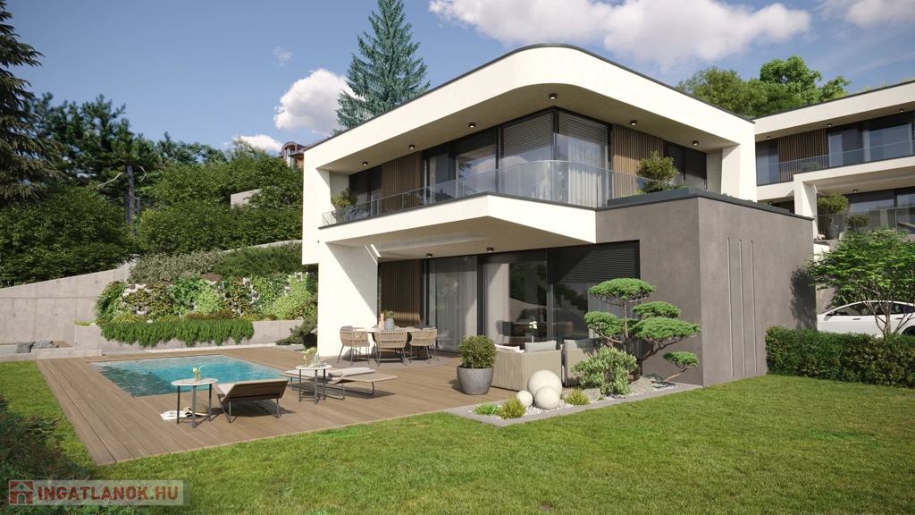 Nettó hasznos alapterülete– 193 m2 + 44 m2 terasz + különálló medence + 520 m2 kizárólagos használatú privát kertrész.