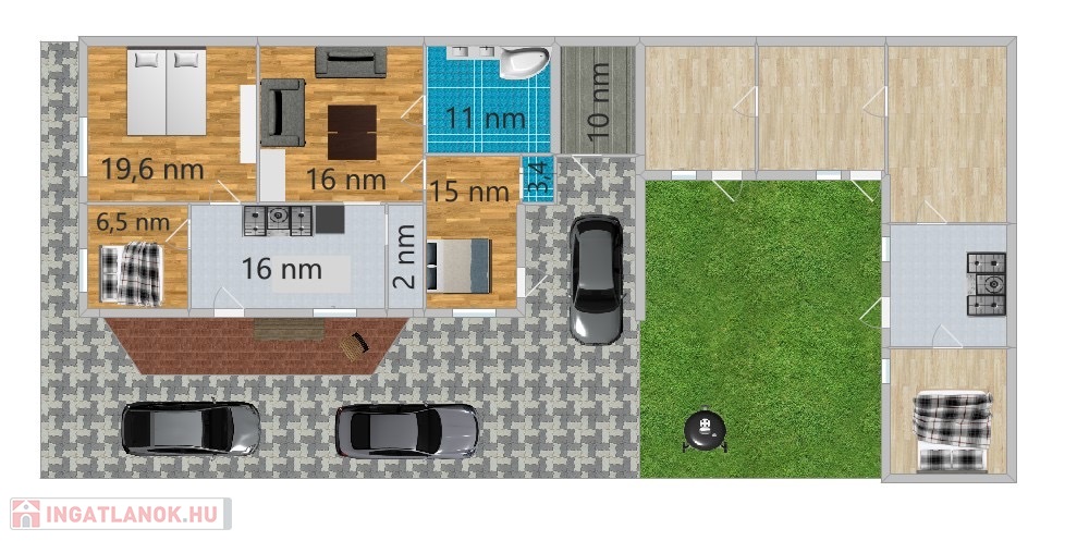 - 3 szoba, 2 fürdő, 1 nappali, 1 garázs