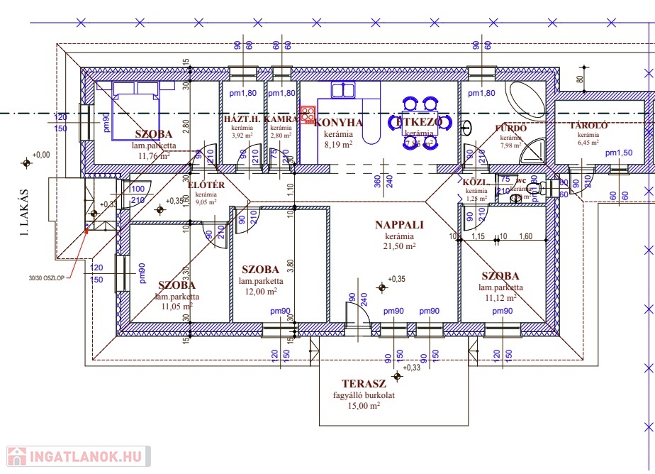 Elosztása: előszoba, háztartási helység, kamra, nappali +konyha, 4 szoba (12nm, 11.76 nm, 11.12nm, 11.05 nm), fürdőszoba, közlekedő, vendég Wc., tároló